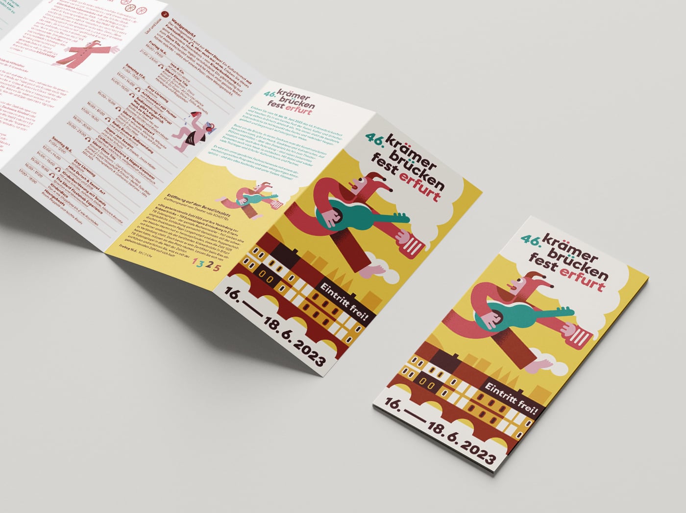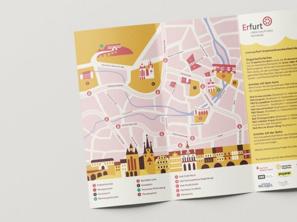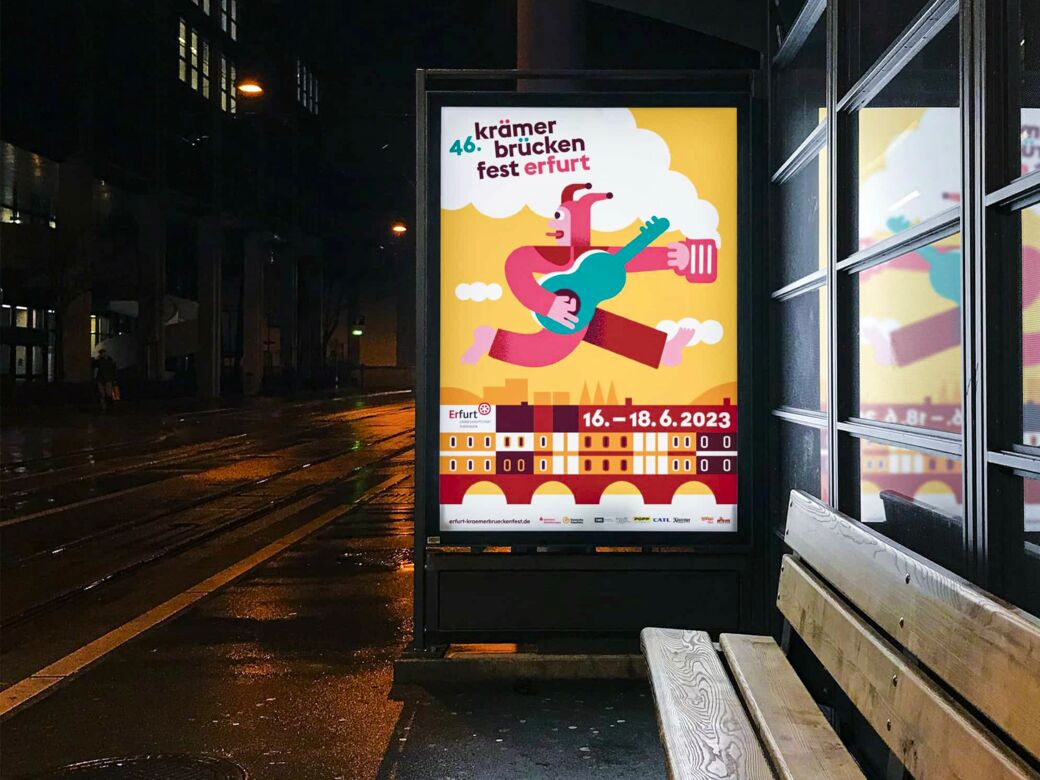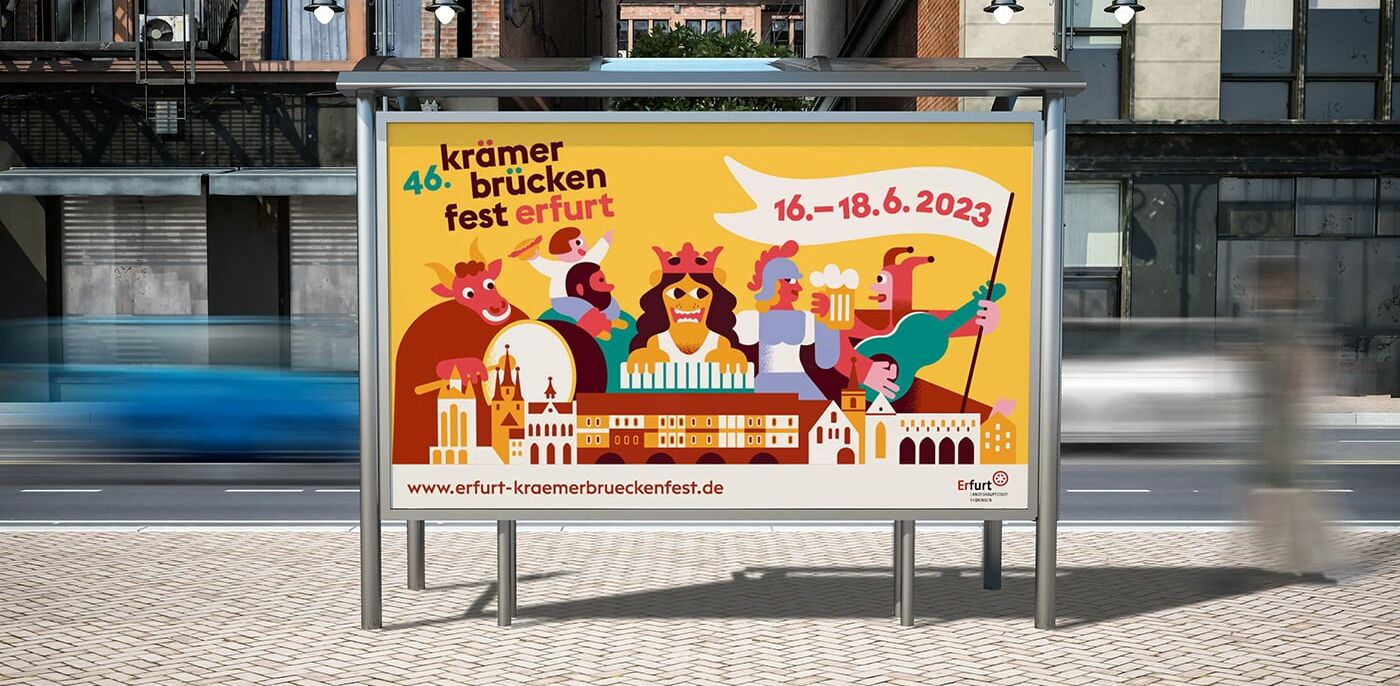 Dabei steht jede der illustrierten Figuren symbolisch für eine Spielstätte des Krämerbrückenfestes: Des roten Ochsens Vorbild sitzt z.B. über dem Eingang der Kunsthalle am Fischmarkt, die Minerva beruft sich auf die gleichnamige Statue vom Domplatz, für die Barfüßerruine steht ein Gitarre spielender Bettelorden-Mönch Pate und das New Orleans Festival, das dieses Jahr auf dem Petersberg stattfindet, wird durch einen Jazz-Ritter am Saxofon repräsentiert.