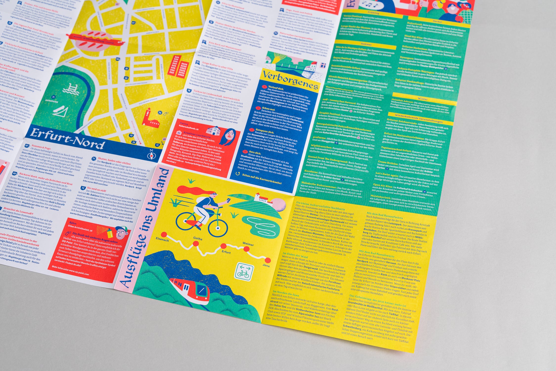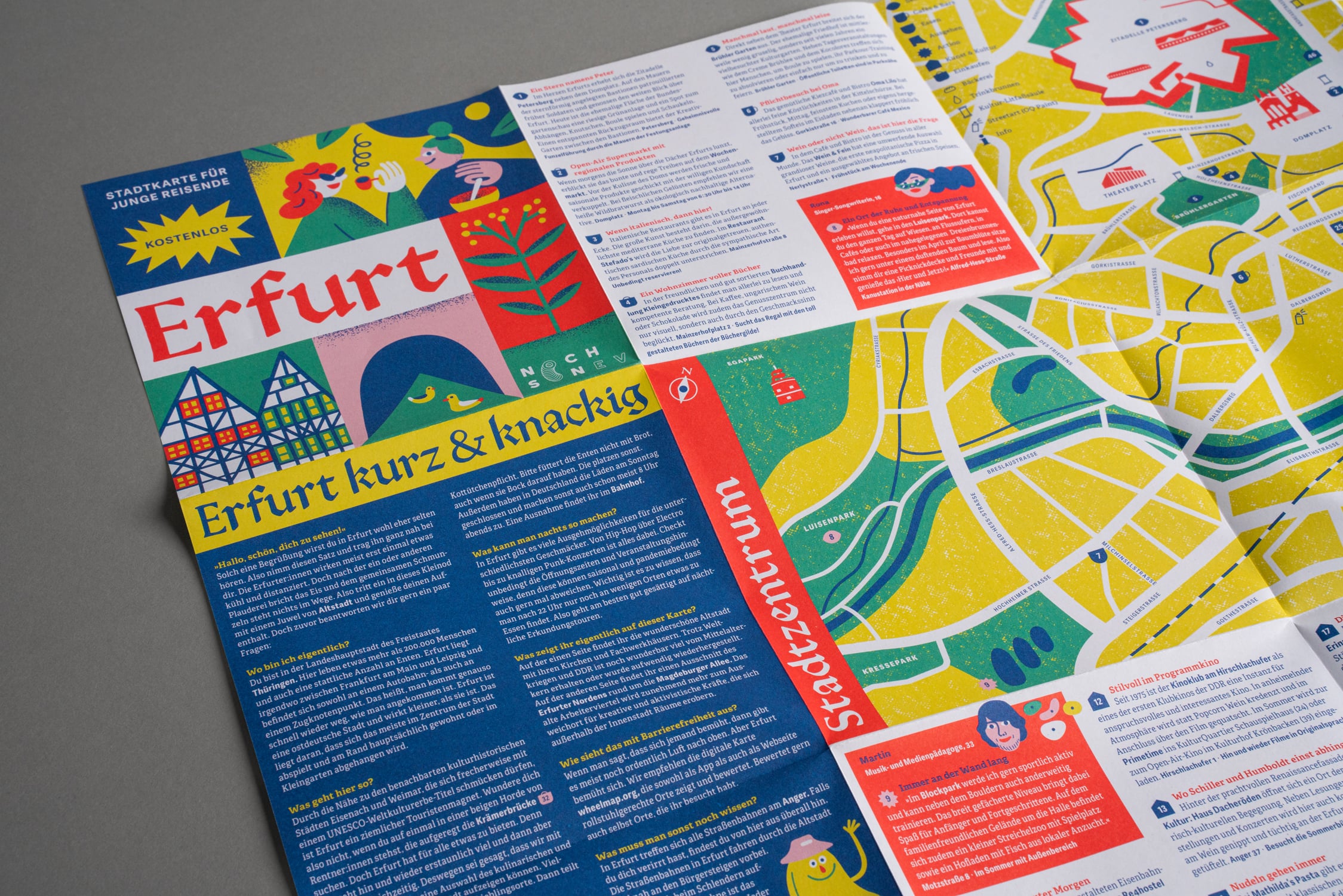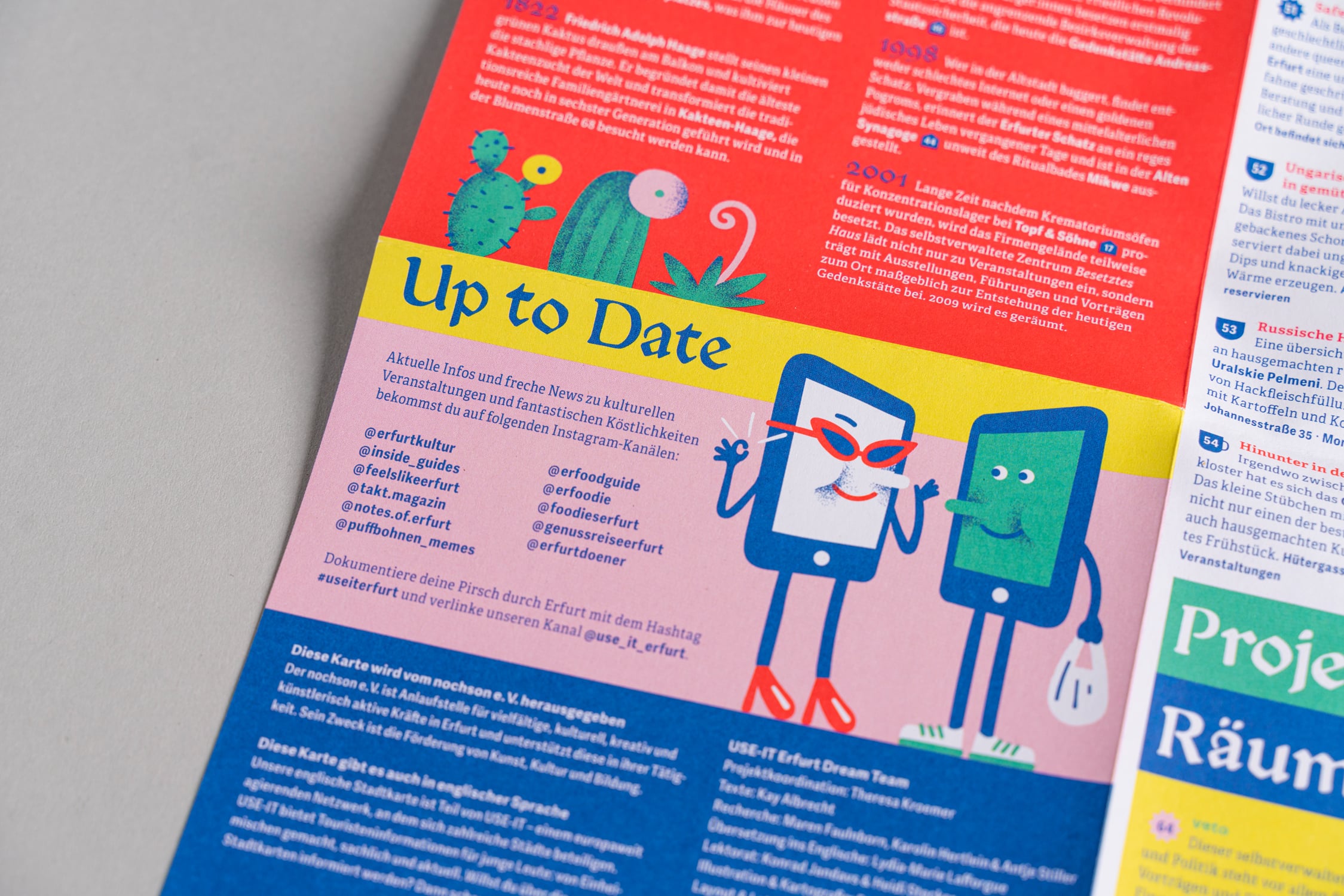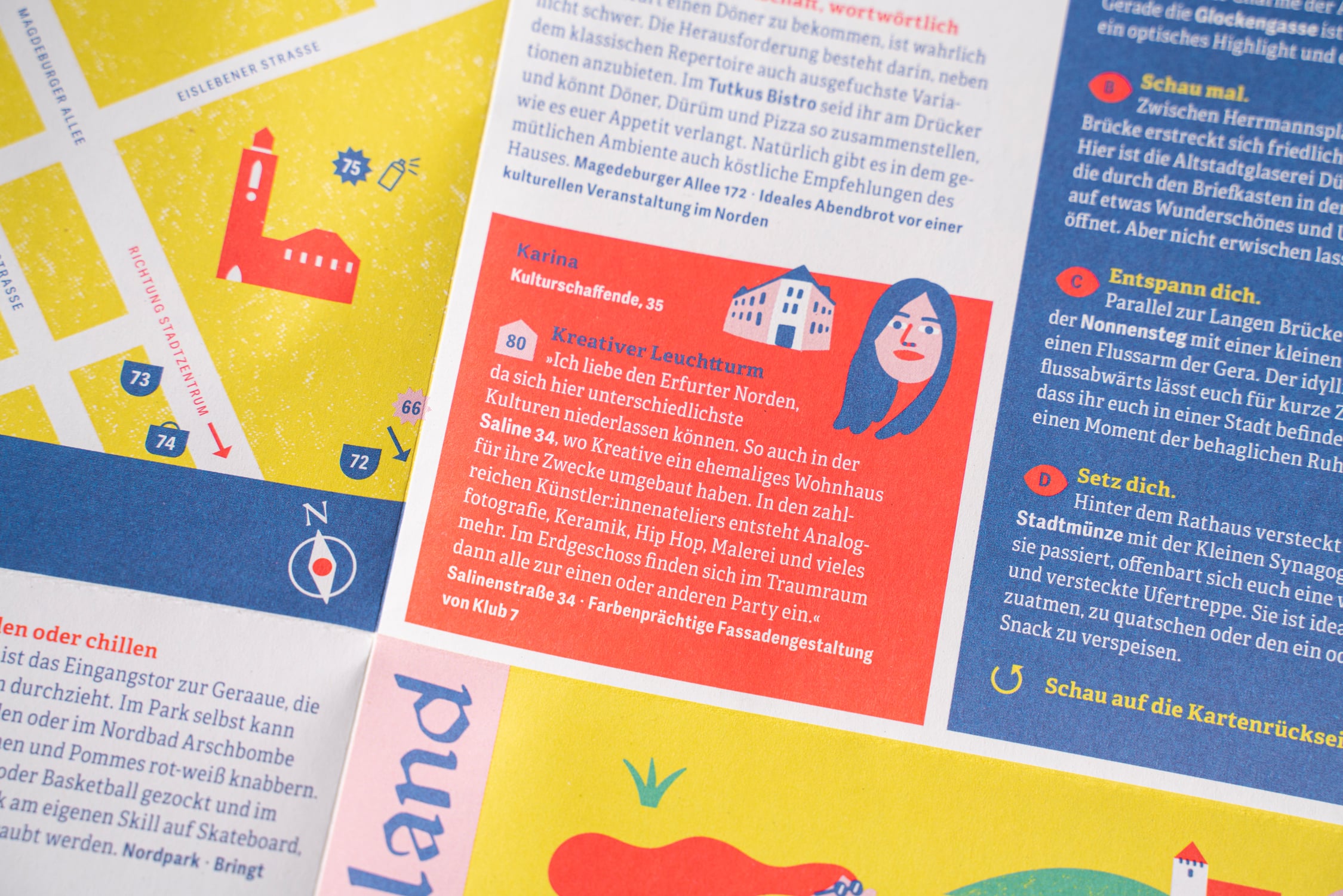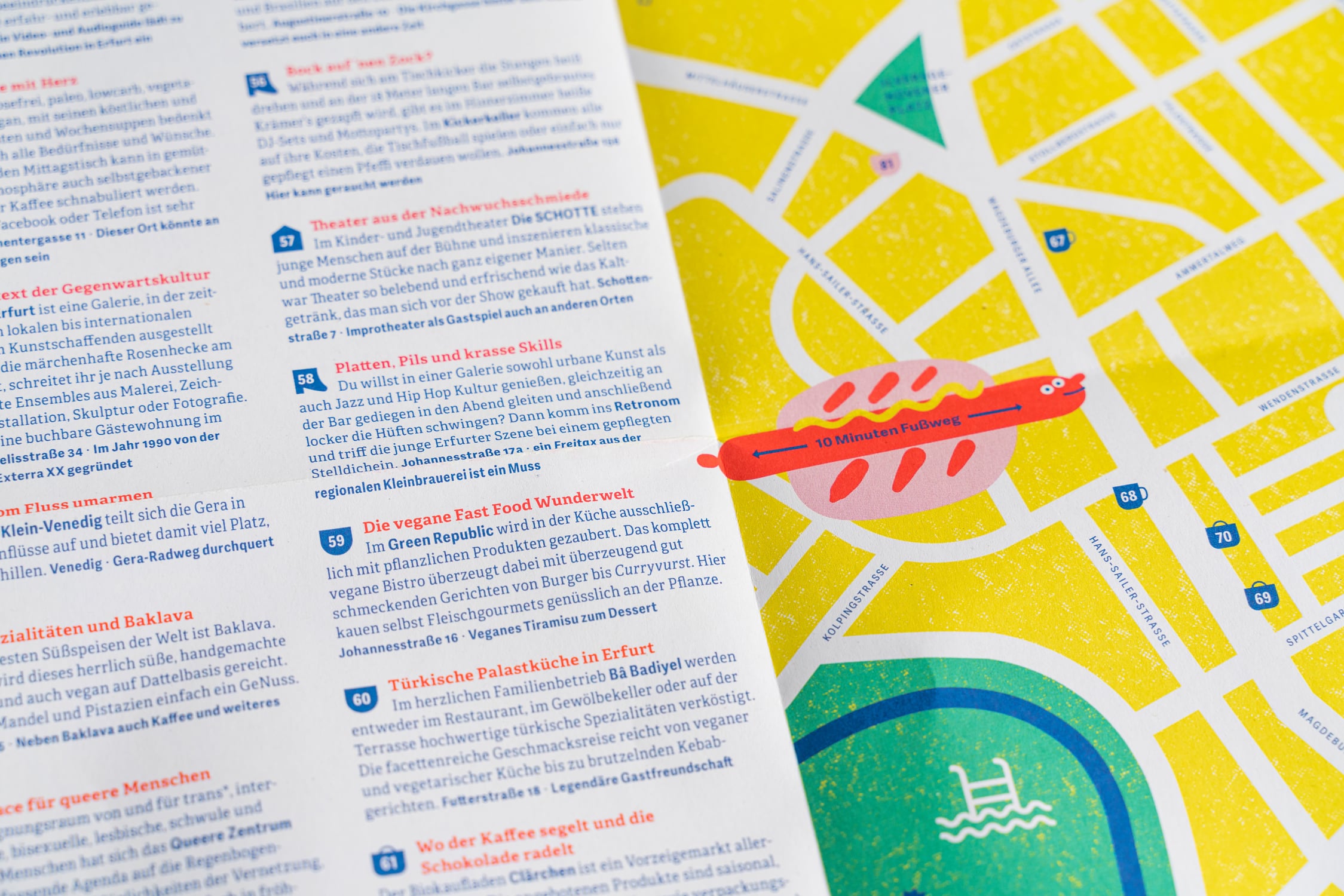 90 Geschäfte, Restaurants und Kneipen sowie Kultur- und Bildungsorte mit Qualitätsgarantie sind in diesem Plan zu entdecken. In jedem dieser Einrichtungen steckt ein Stück „Erfurter Einzigartigkeit“. Die Stadtpläne gibt es bereits in mehreren europäischen Städten. Die Ideenmacherinnen und -macher haben sich im internationalen Netzwerk „Use it“ vereint. Das gleiche Papierformat als Falzplan und eine Sprache, die bei JUNGEN REISENDEN verstanden wird, ist die gemeinsame Basis. Dazu coole Illustrationen, anstatt langweiliger Postkartenfotos und Texte.