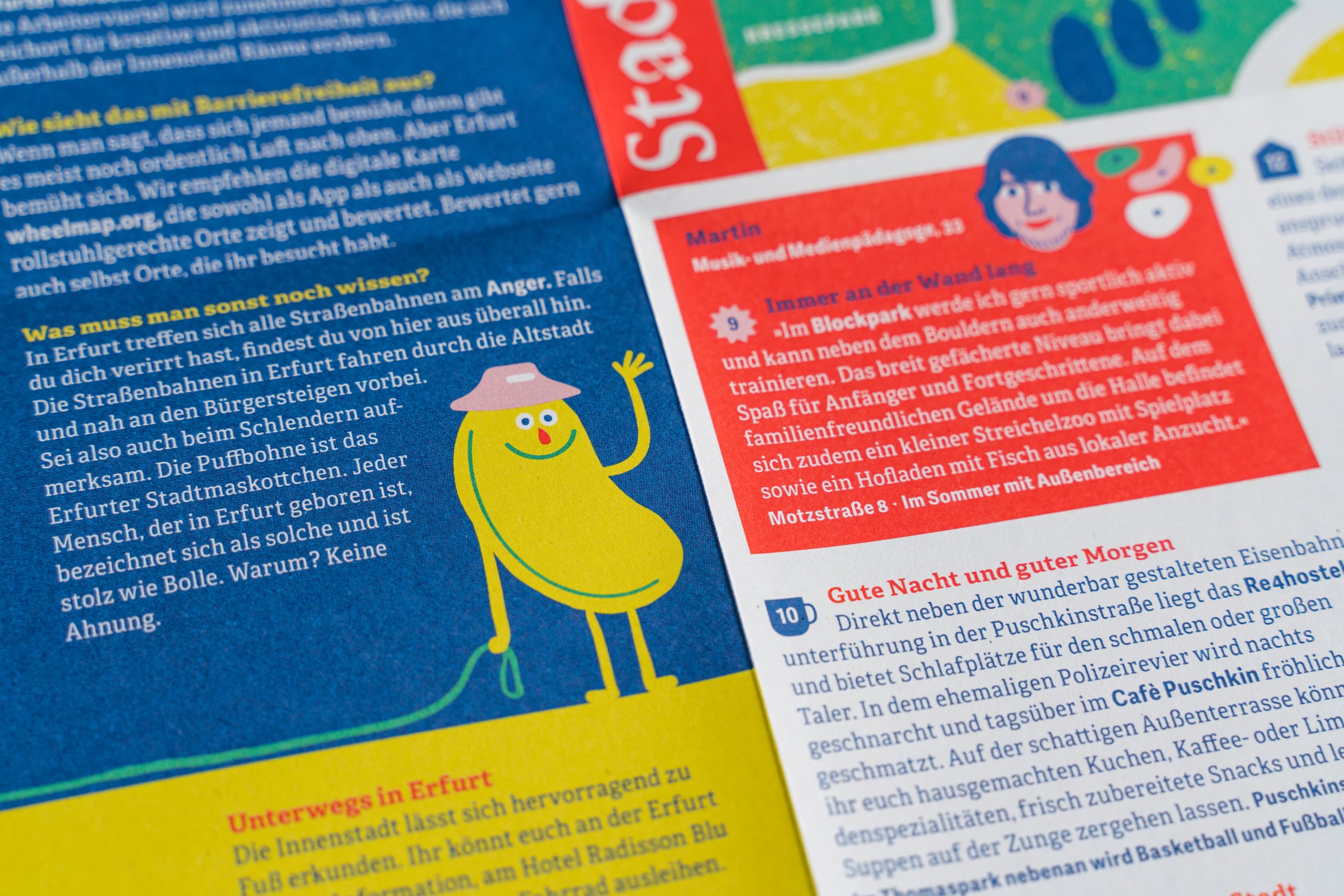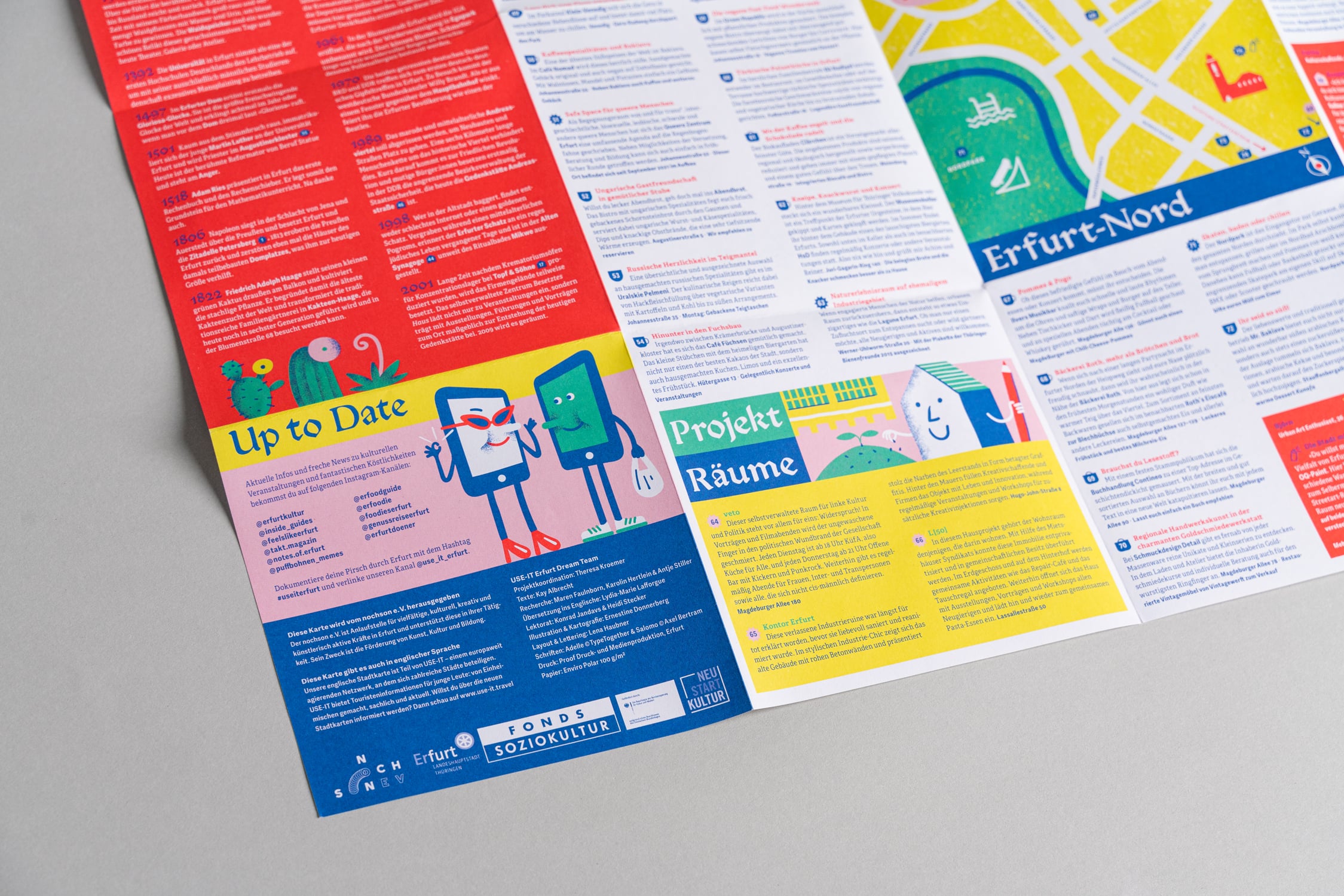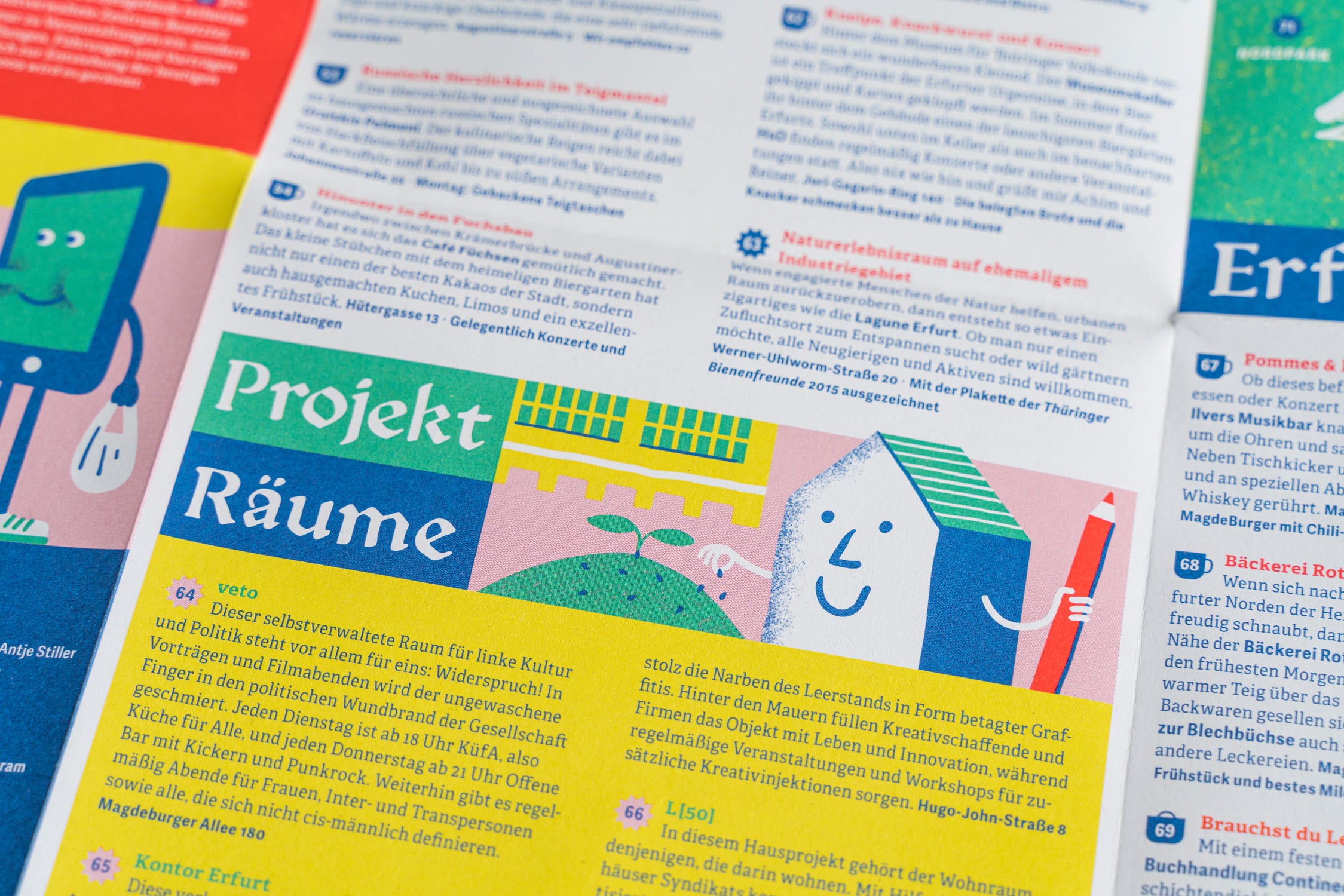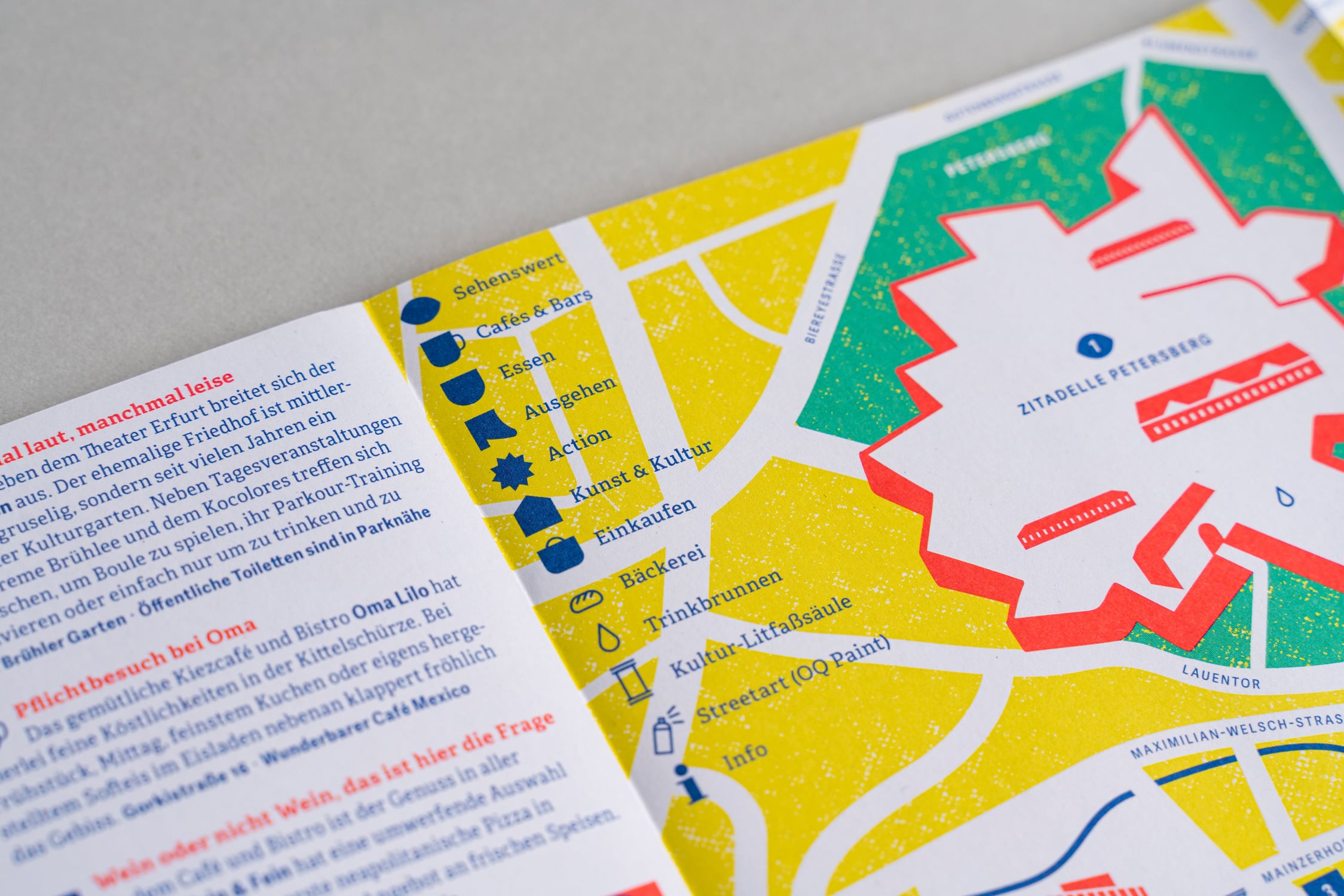 90 Geschäfte, Restaurants und Kneipen sowie Kultur- und Bildungsorte mit Qualitätsgarantie sind in diesem Plan zu entdecken. In jedem dieser Einrichtungen steckt ein Stück „Erfurter Einzigartigkeit“. Die Stadtpläne gibt es bereits in mehreren europäischen Städten. Die Ideenmacherinnen und -macher haben sich im internationalen Netzwerk „Use it“ vereint. Das gleiche Papierformat als Falzplan und eine Sprache, die bei JUNGEN REISENDEN verstanden wird, ist die gemeinsame Basis. Dazu coole Illustrationen, anstatt langweiliger Postkartenfotos und Texte.